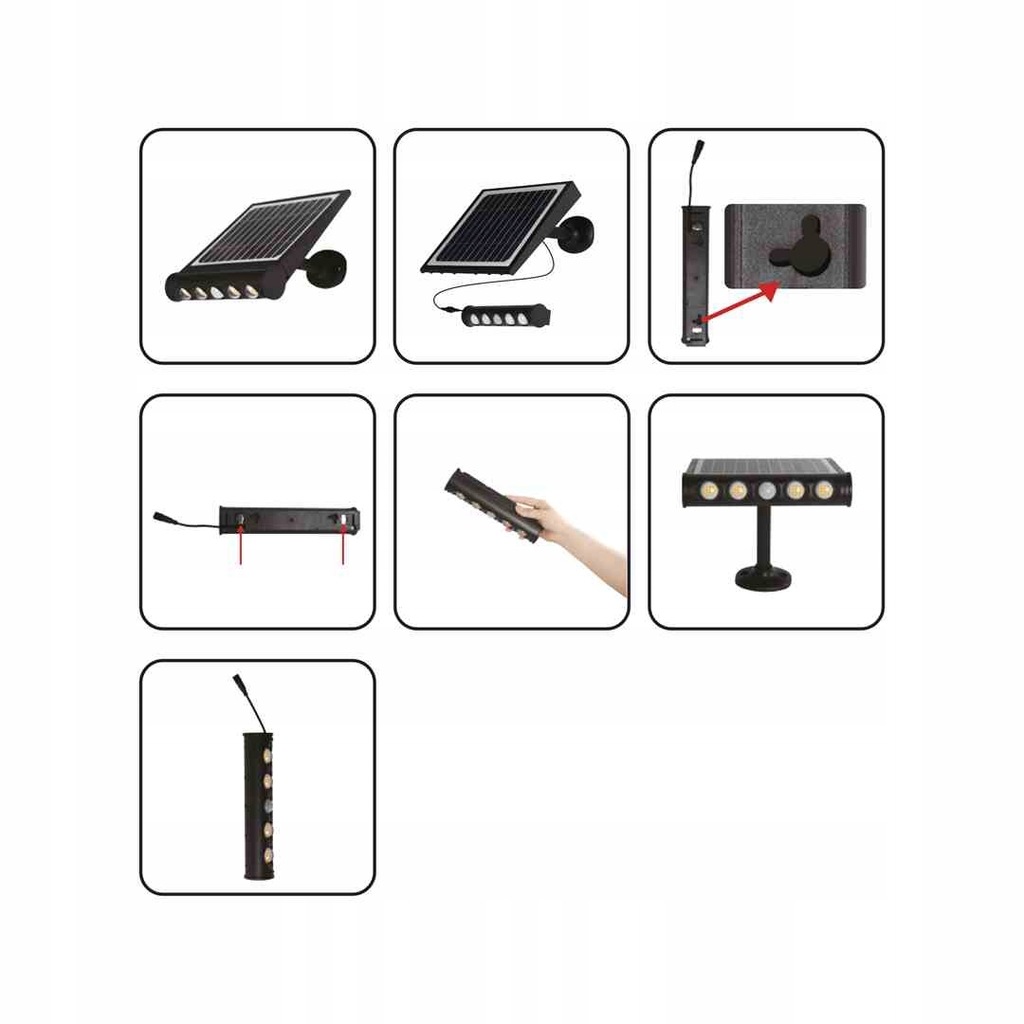 - Montaż: Lampa może być używana zarówno na zewnątrz, jak i wewnątrz. Panel słoneczny można zainstalować na zewnątrz, a lampę wewnątrz. Długość kabla łączącego panel z lampą wynosi 3m.