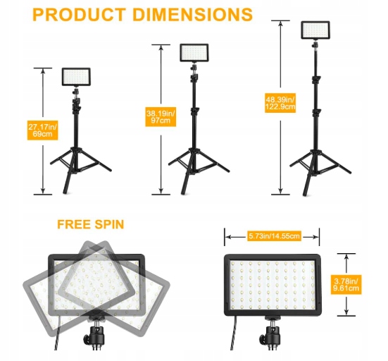 - Elastyczne statywy: Regulowane statywy o wysokości od 84 do 160 cm z głowicą kulową 360° pozwalają na precyzyjne ustawienie kąta świecenia.