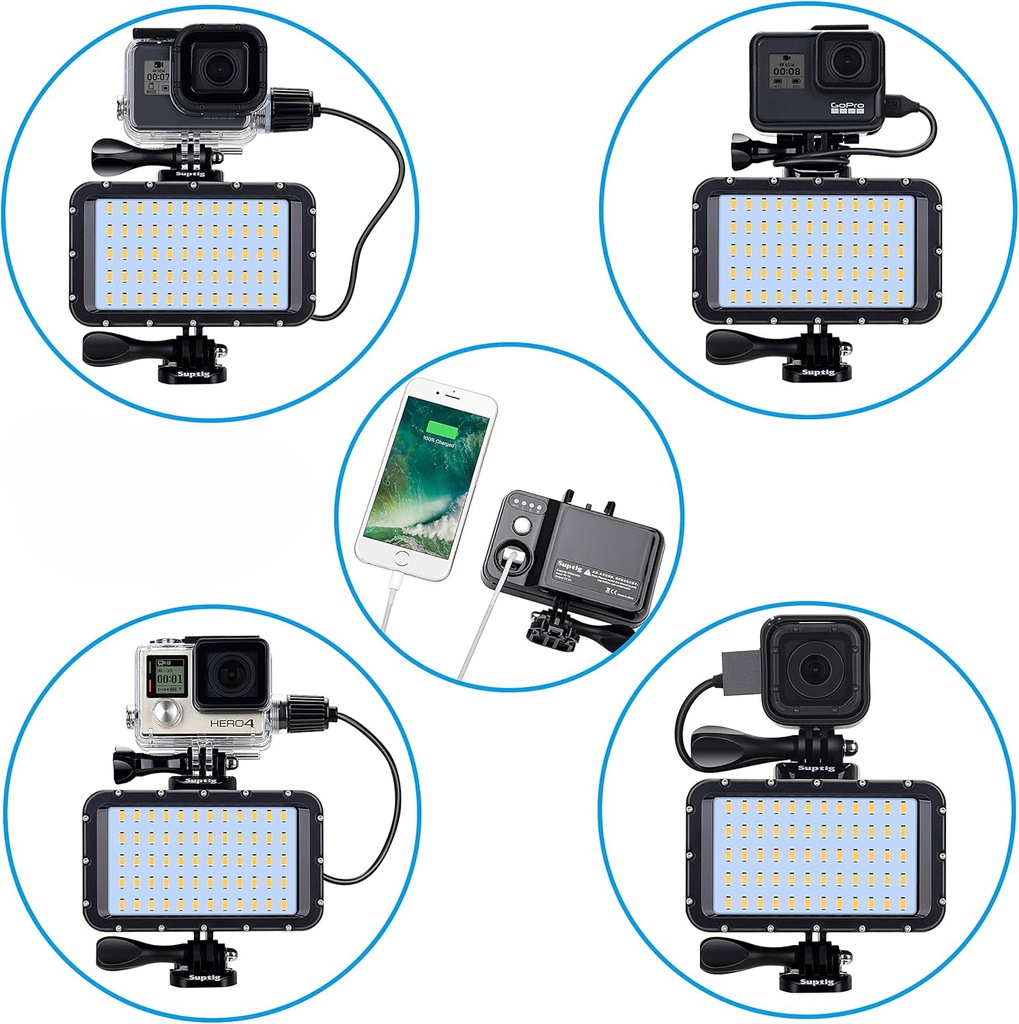 Suptig Dive Lights Wbudowany akumulator litowy 5200 mAh do Gopro Hero 12/Hero 11/ Hero 10/ Hero 9/ Hero 8/ Hero 7/ Hero 6/ Hero 5/ Hero 4/ Hero 3/ Hero 3+/ Hero Session/Gopro Max. Kompatybilny również ze smartfonami, kamerami akcji i aparatami cyfrowymi, lustrzankami cyfrowymi itp.