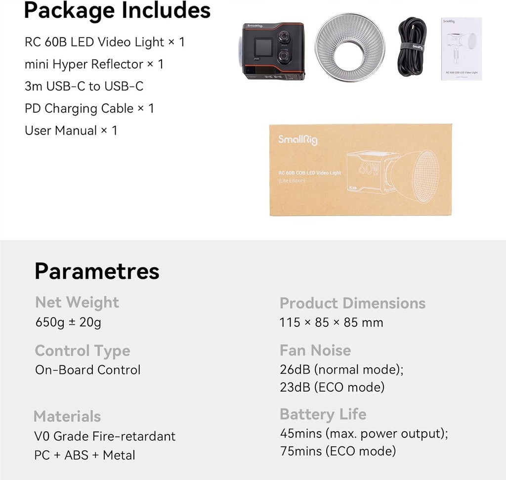 ⭐Lampa wideo LED jest wyposażona w interfejs typu C, który obsługuje szybkie ładowanie PD o mocy do 100 W (kompatybilne z powerbankami PD i adapterami PD o mocy wyjściowej 65W i większej). Obsługuje główne protokoły szybkiego ładowania/zasilania i może być używany podczas ładowania. UWAGA: Ładowarkę PD SMALLRIG 100W do RC 60B - 4315/4370/4371/4372 należy zakupić osobno.