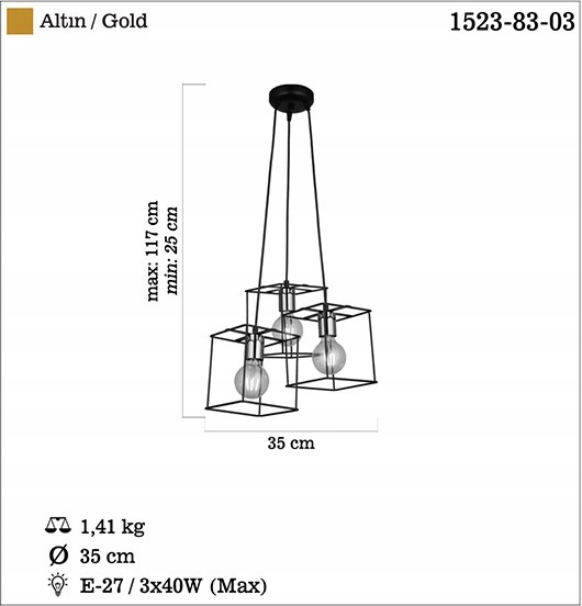 Lampa wisząca trzypunktowa 35cm czarna złoto MAKO 1523-83-03