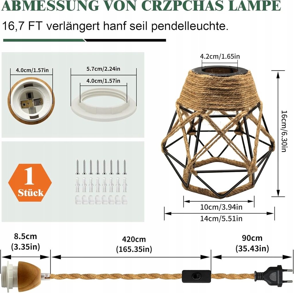 16,7-stopowy regulowany kabel z liny konopnej: Nasza lampa wisząca retro z przełącznikiem składa się z przedłużonego kabla sizalowego o długości 16,7 stopy, co może być dobrym rozwiązaniem problemu ograniczonego wykorzystania krótkich przewodów, a długość rustykalnej lampy wiszącej można regulować w razie potrzeby. Grubszy kabel z liny konopnej, większa nośność, może obsługiwać instalację różnych abażurów. Tekstura liny konopnej jest miękka, łatwa do zginania, wygodna do okablowania.
