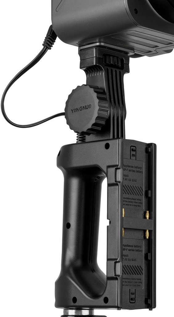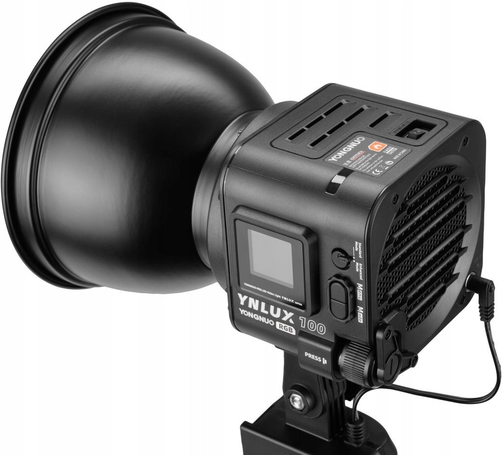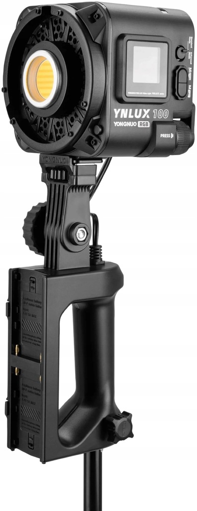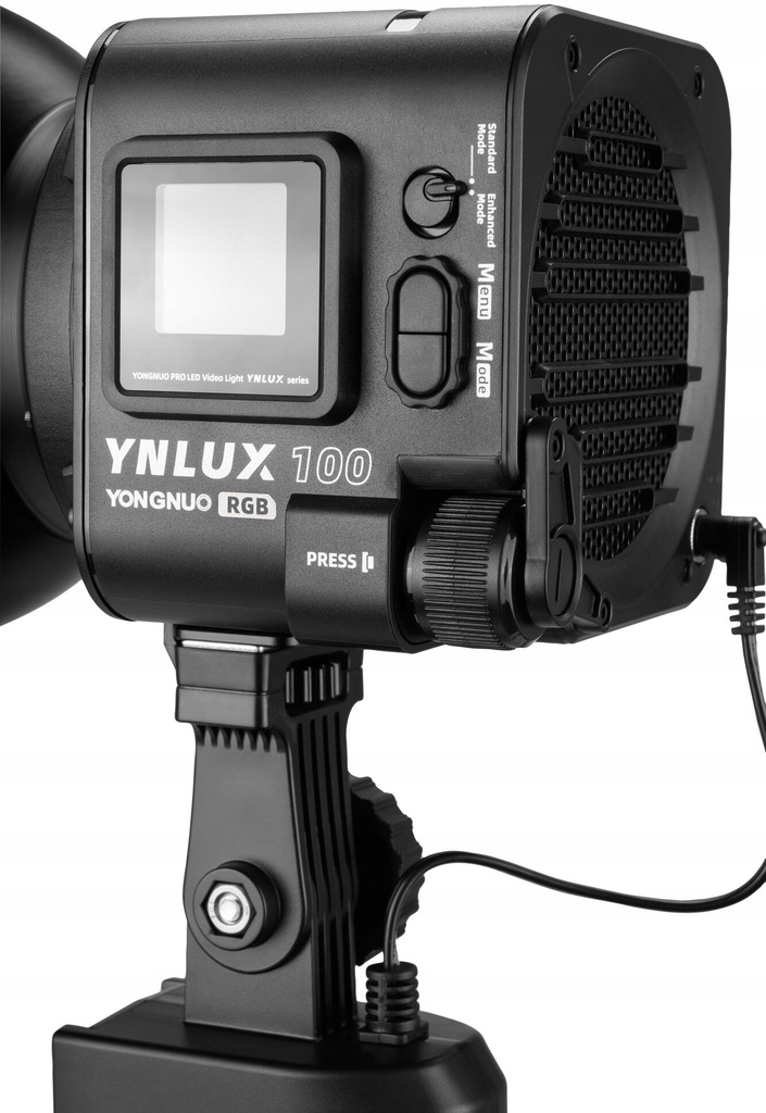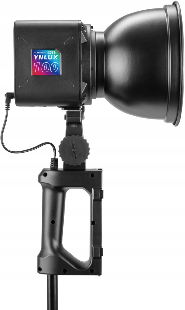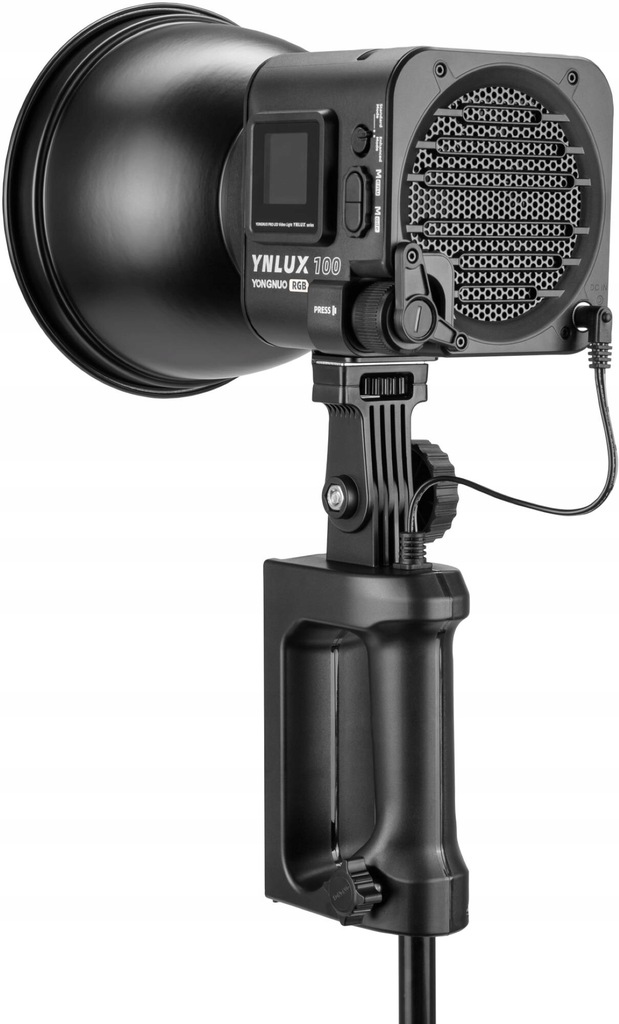 W tylnej części obudowy lampy LED Yongnuo YNRay100 znajdziesz szeroki uchwyt pozwalający w wygodny sposób regulować nachylenie urządzenia. Solidną blokadę optymalnej pozycji urządzenia zapewnia hamulec tarczowy z wygodnym w obsłudze zaciskiem. Na obudowie lampy nie zabrakło też ergonomicznego panelu sterowania z dużymi przyciskami, pokrętłem regulacyjnym oraz jasnym ekranem LCD, który zapewni wygodną obsługę w każdych warunkach oświetleniowych.
