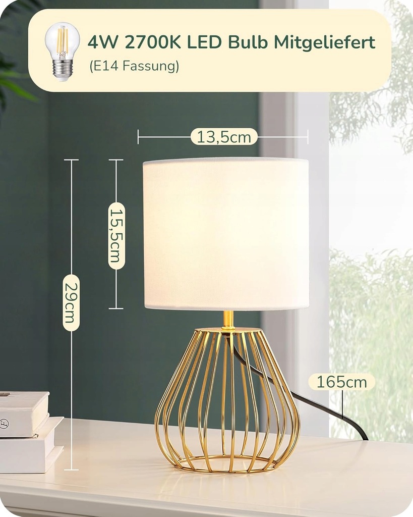 Lampka jest łatwa w montażu – wystarczy zamontować klosz i wkręcić dołączoną żarówkę LED E14 (2700K) o ciepłej, białej barwie. Kompaktowy rozmiar sprawia, że świetnie sprawdzi się na stoliku nocnym, komodzie, parapecie czy biurku.