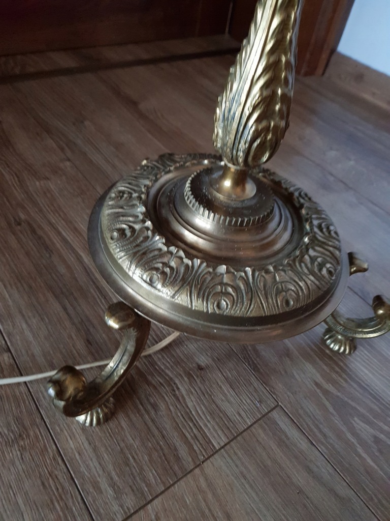 - Lampka podłogowa mosiądzowana z mlecznymi kloszami