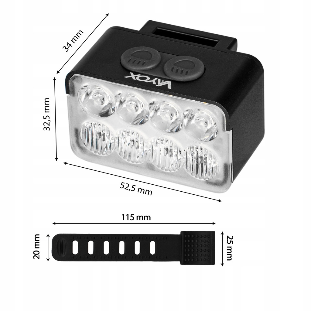 Lampka VA0151 VAYOX wyposażona jest w osiem diod 351B LED, które emitują biały, zimny strumień świetlny o faktycznej mocy 900 lumenów. Obie soczewki - skupiająca i rozpraszająca - zostały zaprojektowane w taki sposób aby nie razić kierowców jadących z naprzeciwka a jednocześnie osiągać efektywny zasięg 100 metrów.