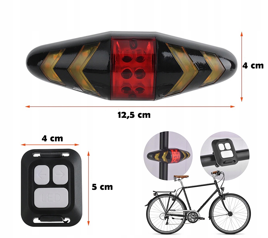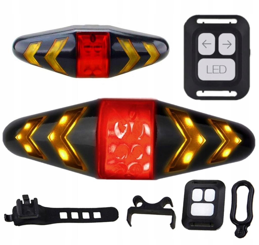 Zestaw oświetleniowy z kierunkowskazem to propozycja do wszystkich rowerzystów, którzy dbają o bezpieczeństwo i chcą poprawić swoją widoczność na drodze. Lampka posiada łącznie 18 mocnych diod LED: 6 do światła czerwonego i 2x po 6 do kierunkowskazów.