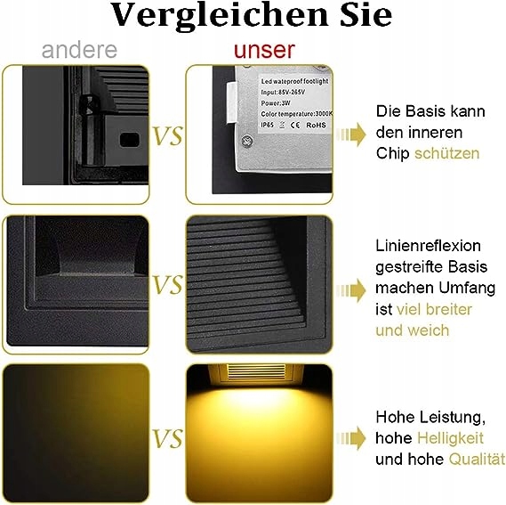 Wodoodporny IP65, odpowiedni do użytku wewnątrz i na zewnątrz, takich jak ogród, patio, schody i stopnie. Dobry wybór jako wpuszczana lampa podłogowa, lampa orientacyjna i lampa dekoracyjna.