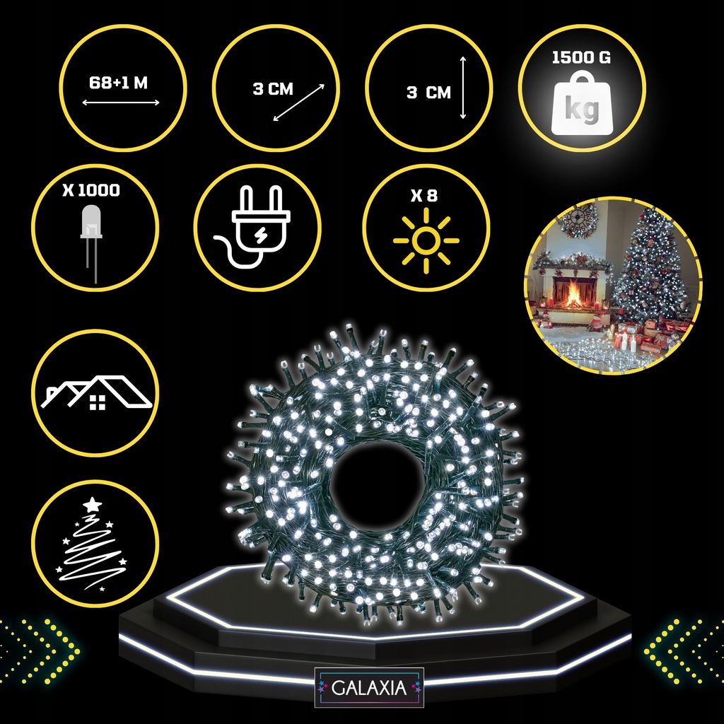 LAMPKI CHOINKOWE 1000 LED 68m Zewnętrzne Świąteczne Białe Zimne Światełka