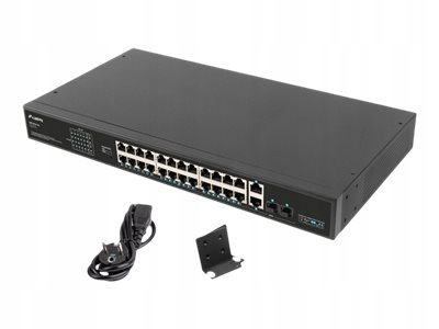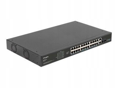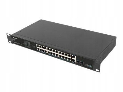 - Porty: 24 x 10/100 (PoE+) + 2 x Gigabit SFP (uplink) + 2 x 1000Base-LX/SX