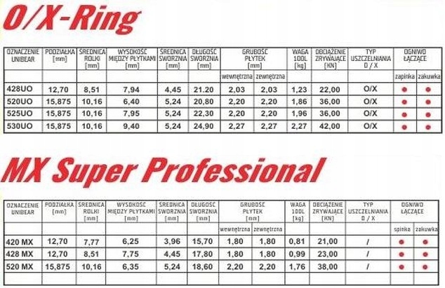 W swojej ofercie posiadamy łańcuchy napędowe między innymi firmy UNIBEAR. Występują one z uszczelnieniami typu X-ring lub O-ring oraz w wersji bez uszczelnień MX. Część z nich jest dostępna w wersji złotej. Do każdego łańcucha dołożone są dwa ogniwa łączące w formie zapinki i zakuwki. Ogniwa te można u nas nabyć również oddzielnie. Łańcuchy UNIBEAR są dostępne w szerokościach: 420, 428, 520, 525 i 530. Wszystkie łańcuchy tego producenta są wykonane ze stopu stali poddawanej zaawansowanym procesom obróbki cieplnej. Materiał ten jest odporny na rozciąganie, uderzenia i zmęczenie. Łańcuchy UNIBEARA charakteryzują się przystępną ceną, niesamowitą trwałością oraz parametrami technicznymi porównywalnymi lub nawet w niektórych przypadkach wyższymi od parametrów konkurencyjnych markowych łańcuchów.