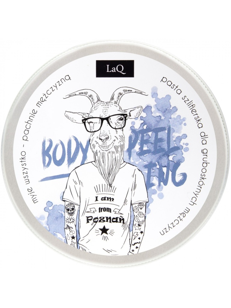 Jestem naturalnym i wegańskim cukrowym peelingiem myjącym, firmowanym twarzą (czy raczej pyskiem) Kozła z k(l)asą. Mam komfortową w użytkowaniu konsystencję lekkiego musu. Nieźle się pienię, dzięki czemu jestem świetną alternatywą dla żelu pod prysznic. Pachnę prawdziwie męsko i z klasą.