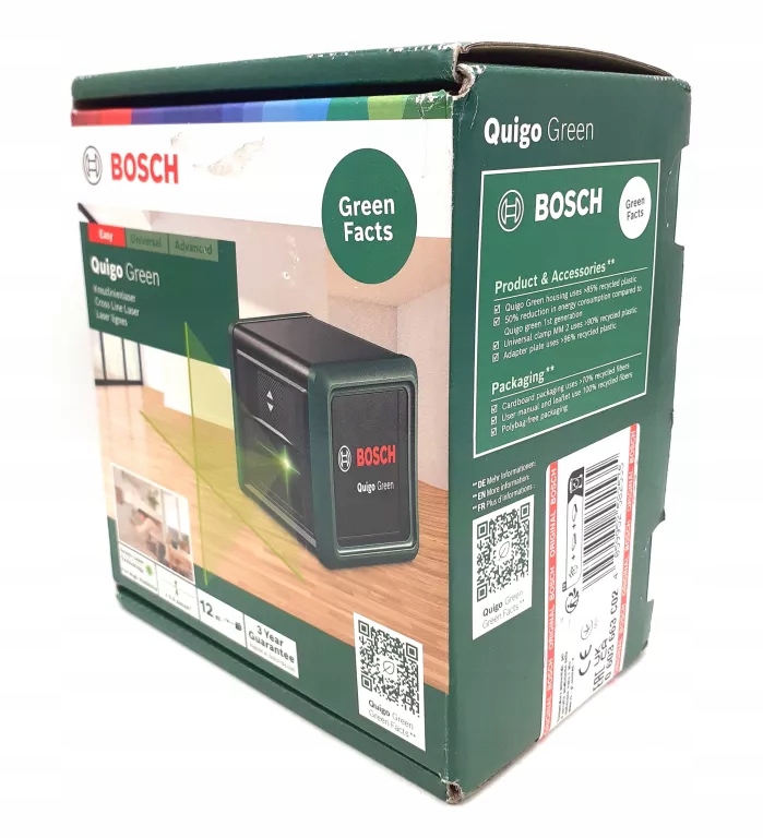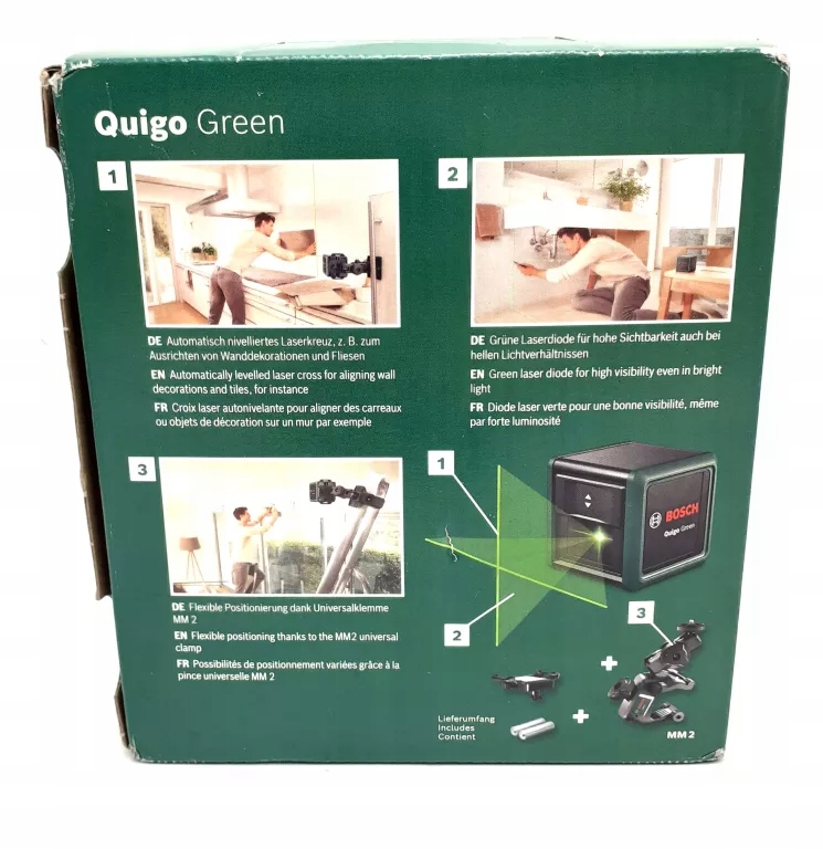 Laser krzyżowy Quigo Green jednocześnie wyświetla poziomą i pionową, intensywnie świecącą zieloną linię lasera, a dzięki automatycznie wyprostowanym liniom ułatwia precyzyjne znakowanie obiektów lub wzorów. Technologia zielonego lasera zapewnia do czterech razy lepszą widoczność niż czerwone linie laserowe, nawet przy jasnym oświetleniu. Quigo Green oferuje maksymalny zasięg roboczy 12 metrów i jest idealny do mocowania obrazów lub półek, mocowania tapet, obramowań lub płytek oraz wyrównywania różnych przedmiotów dekoracyjnych.