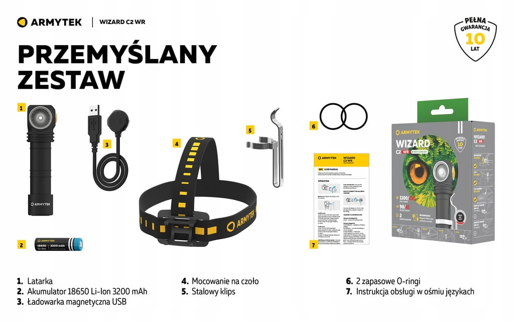 Dodatkowe czerwone światło o mocy 230 lumenów jest skuteczne w mglistych lub w warunkach ograniczonej widoczności. Może być również używany jako tylny wskaźnik rowerowy lub migające światło ostrzegawcze. Latarkę docenią wędkarze i myśliwi: czerwone światło nie wystraszy zwierzęcia ani ryby. Wizard C2 WR ma również dodatkową zaletę na zewnątrz — pozwala na używanie latarki bez przyciągania natrętnych owadów.