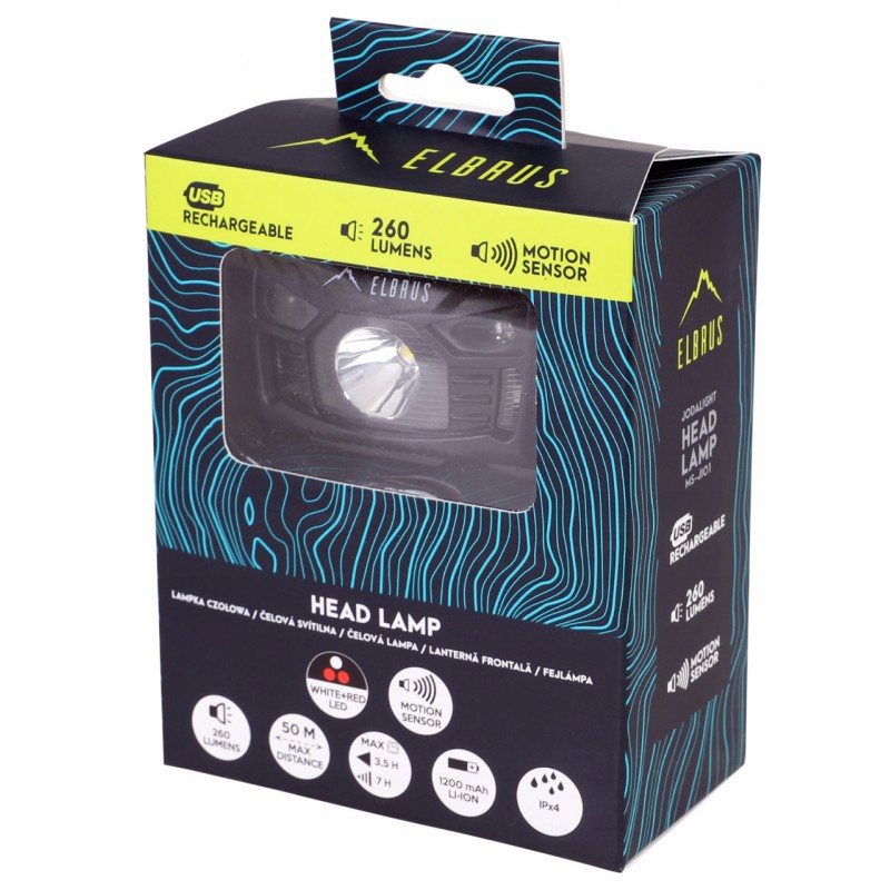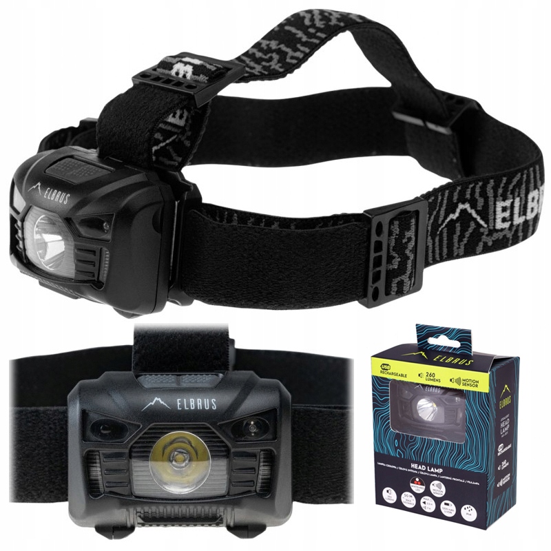 W najmocniejszym trybie czołówka generuje jasne światło o mocy 260 lumenów. Wodoodporna czołówka turystyczna marki Elbrus posiada baterię litowo-jonową o pojemności 1200 mAh, która ładowana jest przez kabel USB. Całość zapakowana jest w estetyczne pudełko producenta.