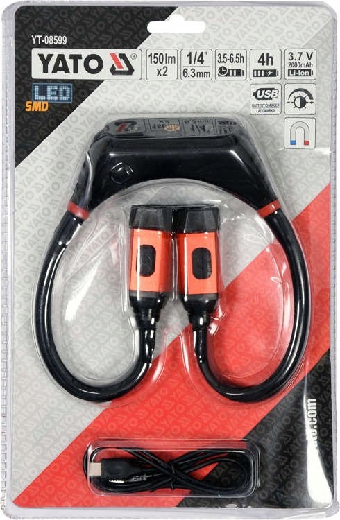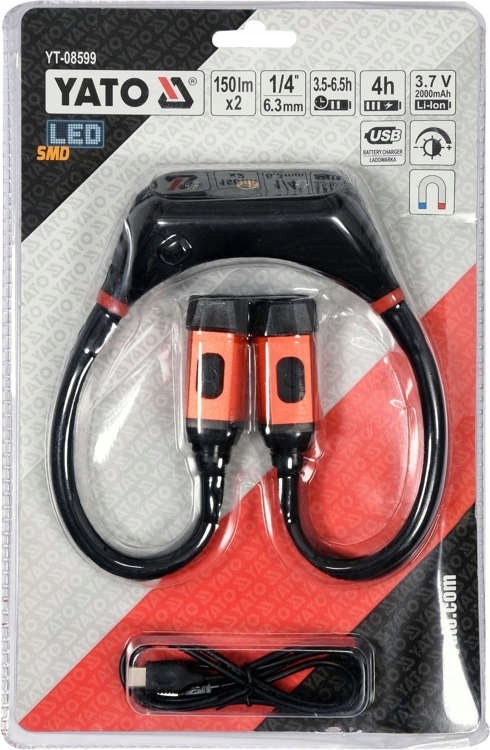 Unikalna latarka na szyjkę Yato to idealne rozwiązanie dla osób, które w czasie wykonywania prac potrzebują mieć wolne ręce a nie chcą lub nie mogą korzystać z latarki czołowej. Produkt wyposażony w magnes oraz gwint co zwiększa możliwości jego zastosowania. Elastyczne ramiona oraz płynna regulacja światła ułatwią dostosować kierunek i moc oświetlenia do wykonywanej czynności. Latarka wyposażona w mocny, litowo-polimerowy akumulator o pojemności 2000mAh, który zapewnia od 3,5 do 6,5 godzin pracy.