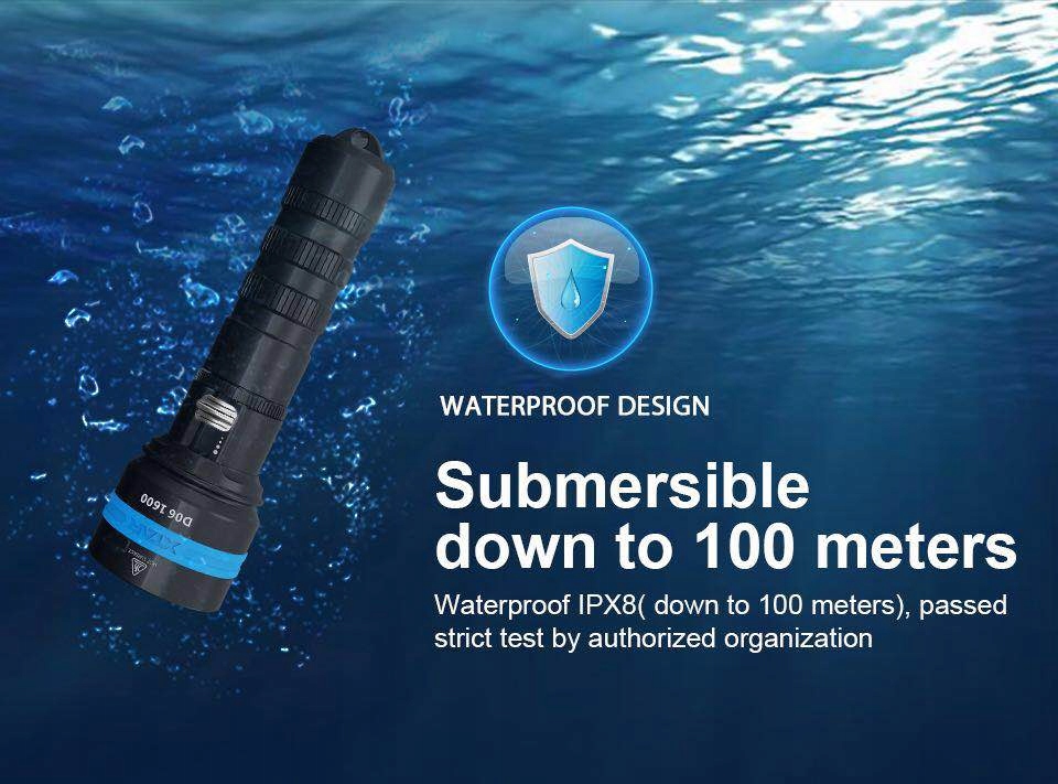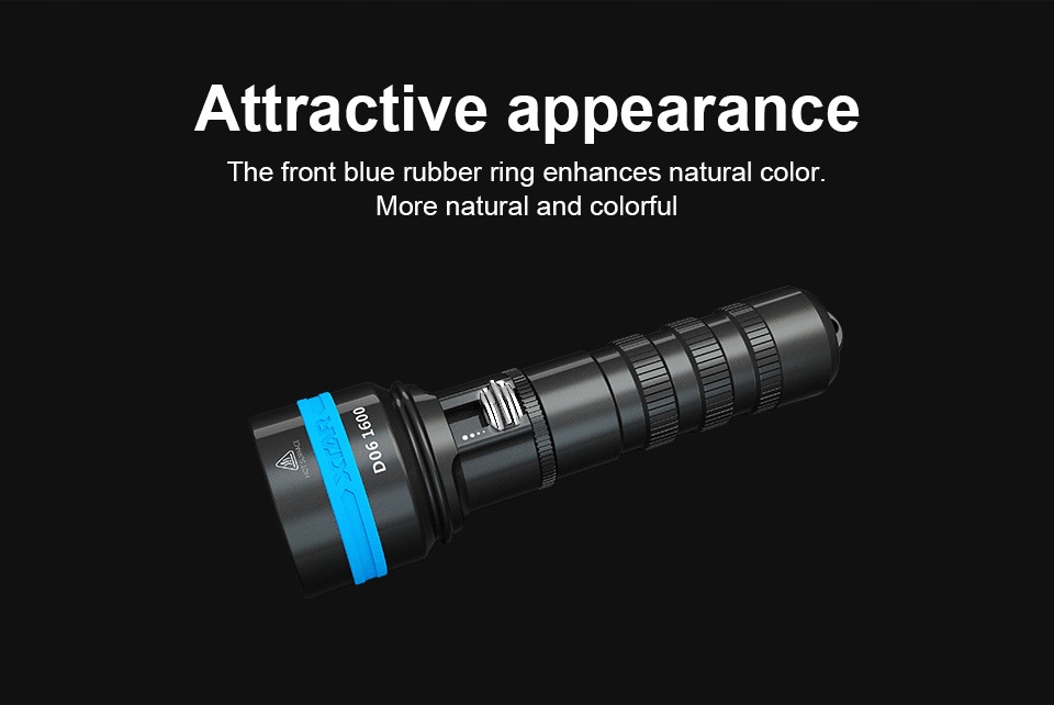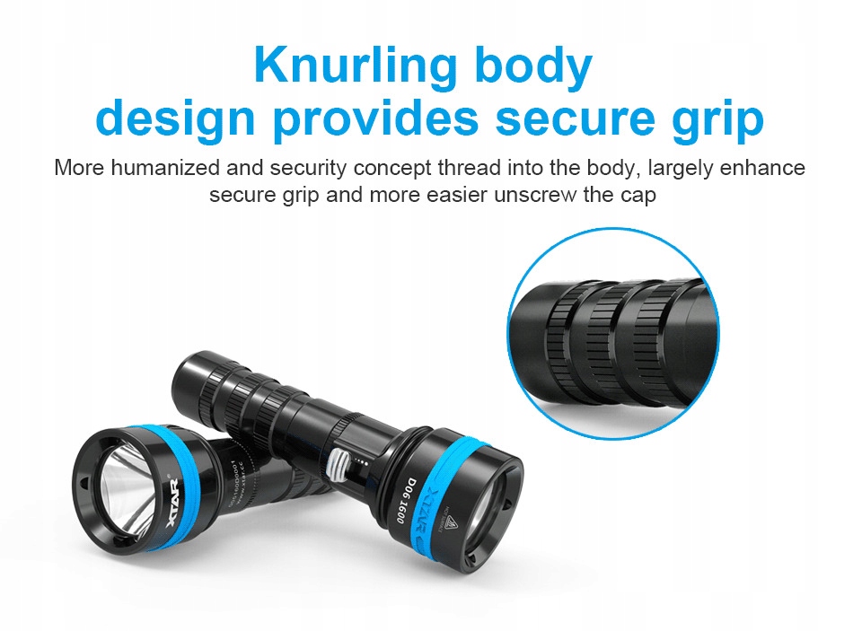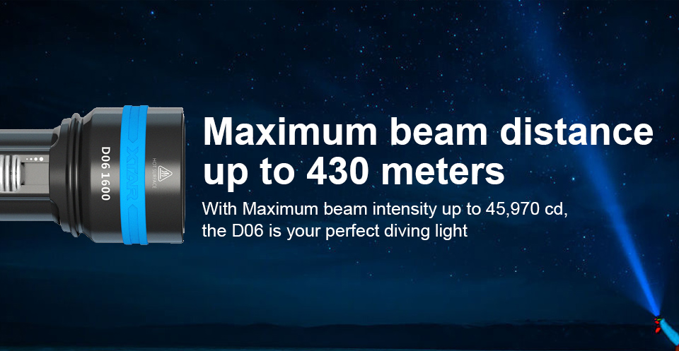 Xtar D06 1600lm to wysokiej jakości latarka do nurkowania z oryginalną diodą Cree XHP35-HI D4 oferująca światło o mocy 1600 lumenów i zasięgu 430 metrów. Precyzyjnie wykończona, doskonale spasowana obudowa latarki D06 1600lm została wykonana z wysokiej jakości stopu aluminium lotniczego 6N03 typ III odpornego na upadki z wysokości 1,5m. Dodatkowo całość została pokryta środkiem antykorozyjnym. Konstrukcja została uszczelniona o-ringami zapewniającymi stopień ochrony IPX8 (wodoszczelność do 100m). Wysokiej jakości kontakty i trzy pozłacane sprężyny zapewniają bardzo dobry styk akumulatora i wysoką odporność na wstrząsy.