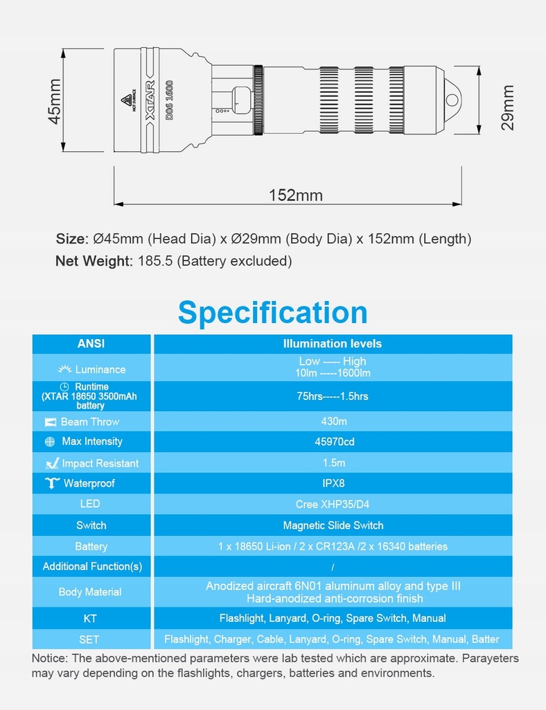 Wysokiej jakości latarka do nurkowania Xtar D06 1600lm (zestaw)
