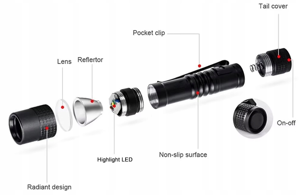 - Dioda LED zapewnia długi czas pracy na jednej baterii.