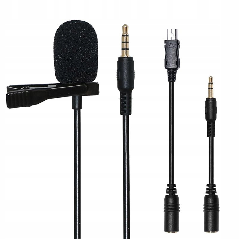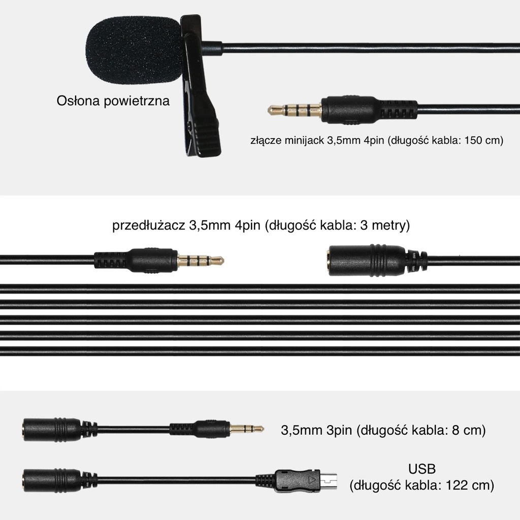 1) Mikrofon z kablem odpowiednim do smartfonów, tabletów i laptopów (długość kabla: 150 cm)