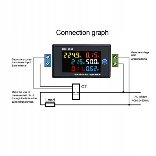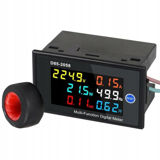 Parametry: zakres pomiaru napięcia miernika AC jest AC40-300V / AC200-450V, AC40-300V / AC200-450V, Aktualny zakres pomiarowy IS0-9999a, Zakres mocy aktywnej 40-300V wynosi 0-30000W; 200-450V wynosi 0-45000W, zakres energii elektrycznej wynosi 0-99999W