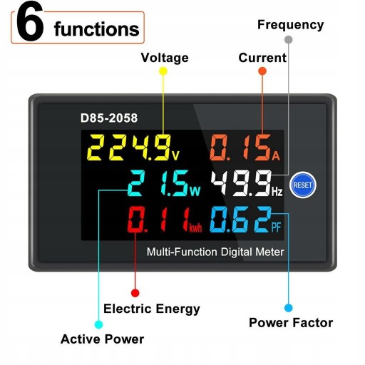 6 Funkcje Wyświetlacz LED koloru: napięcie, częstotliwość, prąd, energia elektryczna, moc działania, współczynnik mocy