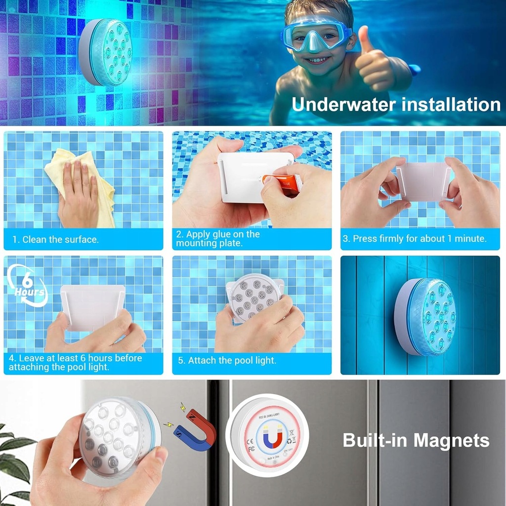 Każda lampa wyposażona jest w specjalną płytę montażową i mocny klej, który zapewnia stabilne mocowanie do ścian basenu, akwariów, płytek czy szkła. Instalacja jest możliwa nawet pod wodą, bez konieczności spuszczania wody.