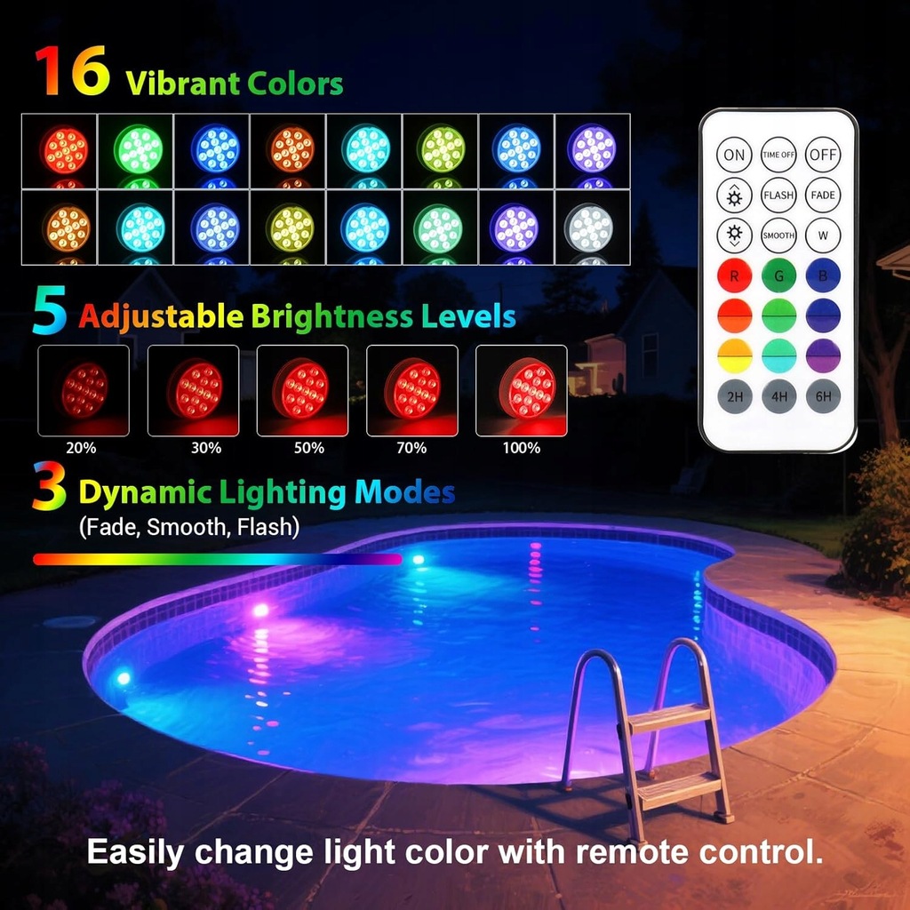 Zdalne sterowanie RF działa na odległość do 50 m na powietrzu i 5 m pod wodą, bez konieczności kierowania pilota bezpośrednio na lampę. Obsługuje funkcję timera: 2h, 4h, 6h. Jednym pilotem sterujesz wszystkimi lampkami.
