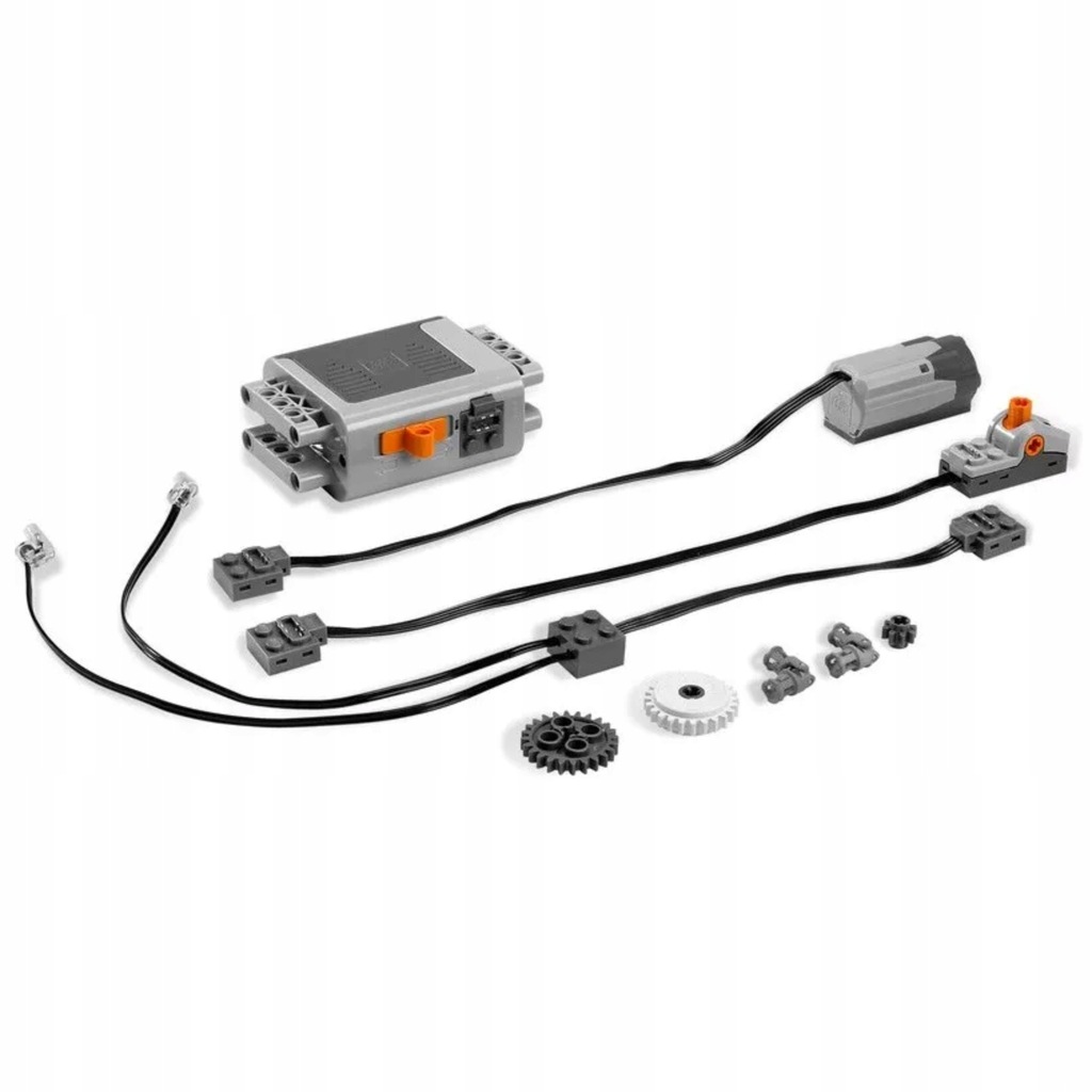 Zestaw zawiera silnik - M, pojemnik na baterie, kabel oświetleniowy, przełącznik oraz zębatki i łączniki.
