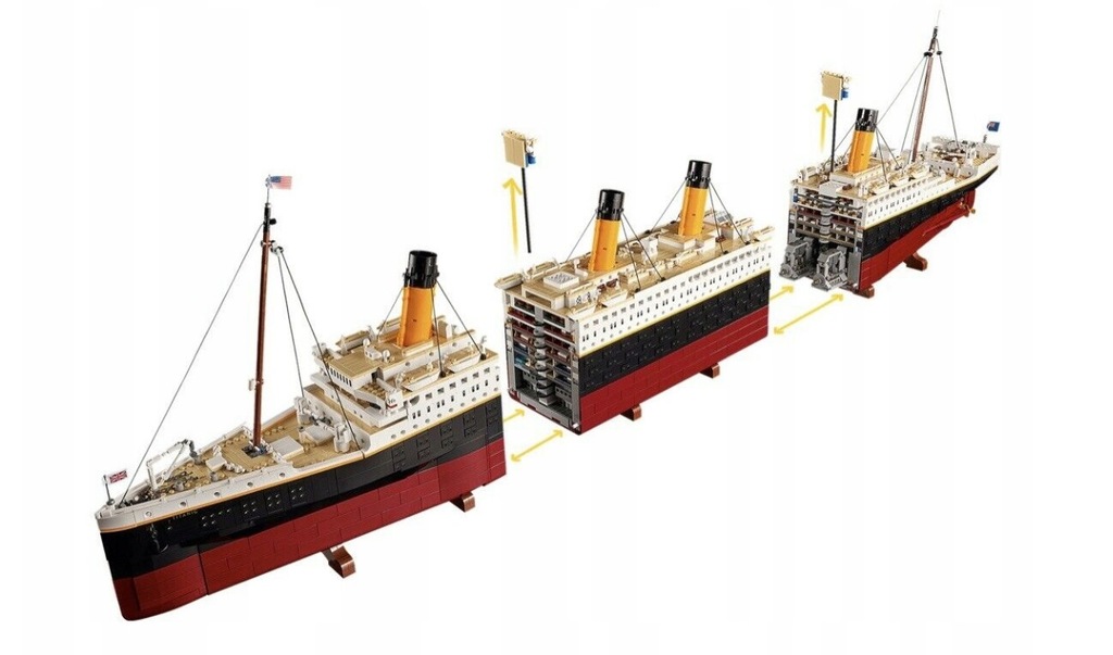 - Statek dzieli się na trzy sekcje, więc można zajrzeć do środka. Gdy go zbudujesz, będzie można podziwiać wspaniałe schody, kabiny, jadalnię, palarnię, czytelnię oraz basen.