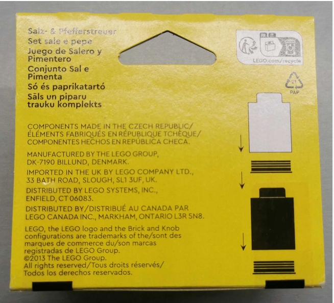 - Zestaw zawiera 2 elementy: solniczkę i pieprzniczkę LEGO® w kształcie klocków z pojedynczą wypustką (600 razy większych od standardowego klocka) w czarno-białej wersji kolorystycznej.