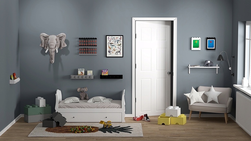 Duży pojemnik w kształcie klasycznego klocka LEGO® w radosny sposób pomaga uporządkować dziecięcy pokój.