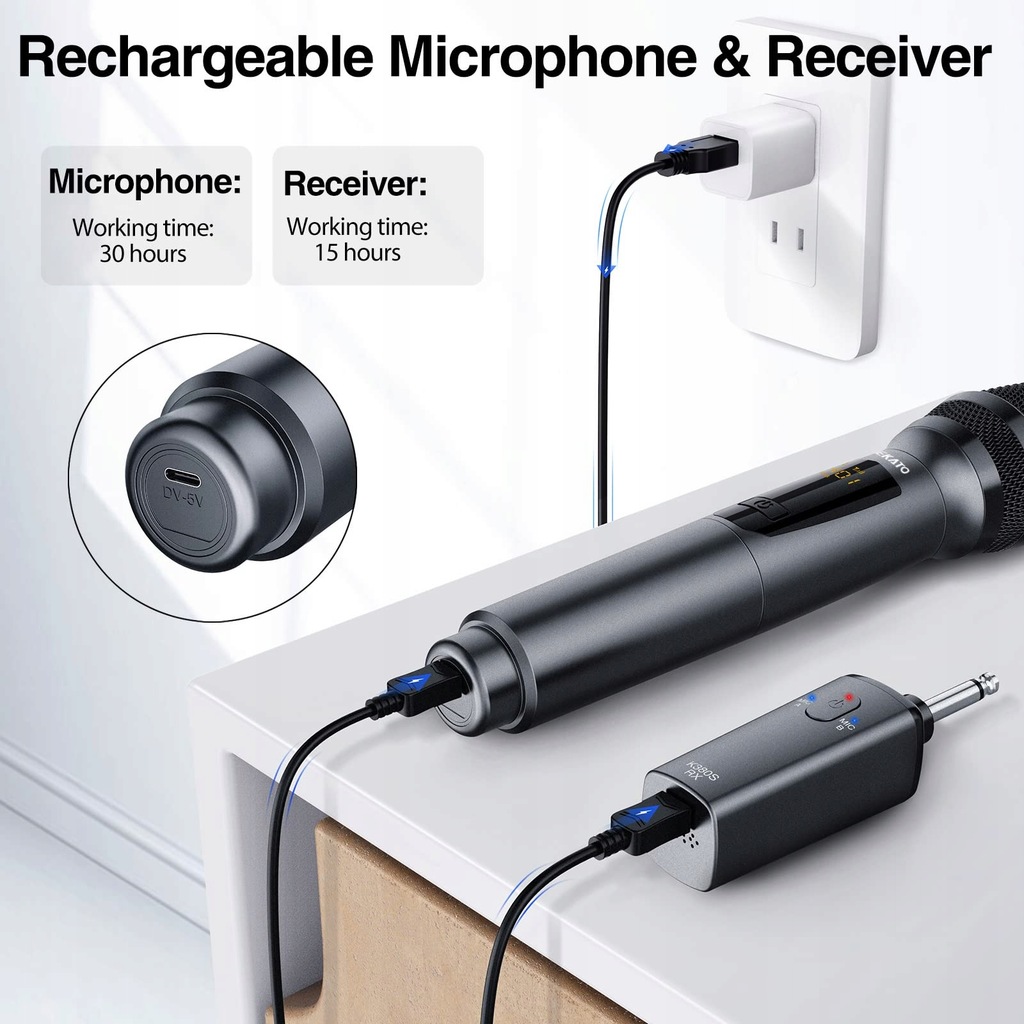 - nazwa przedmiotu: LEKATO Mikrofony bezprzewodowe 2,4 GHz Podwójne mikrofony Możliwość ładowania do 30 godzin pracy na baterii Zestaw metalowych mikrofonów do karaoke Pieśń Kościół, impreza, ślub
