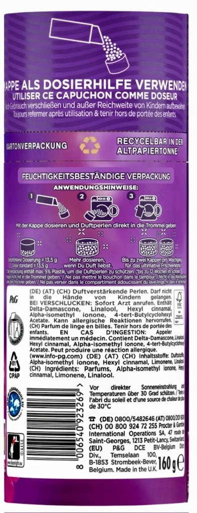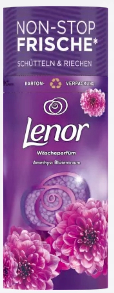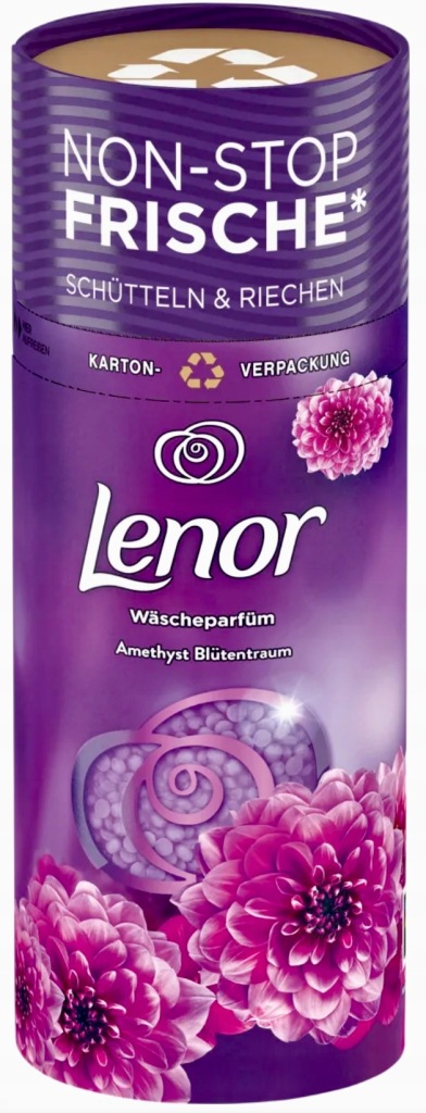 Odkryj perfumy do prania Lenor, które zapewnią praniu nieprzerwany zastrzyk świeżości. Lenor nadaje ubraniom w szafie świeży zapach aż do 12 tygodni. Wystarczy dodać bezpośrednio do bębna przy każdym praniu i dozować w zależności od pożądanej intensywności zapachu. Zapach Amethyst emanuje radością życia i pewnością siebie dzięki kwiatowym i urzekającym nutom jaśminu i różowej frezji. Używaj perfum do prania Lenor w połączeniu z odpowiednim detergentem Lenor i płynem do płukania Lenor, aby uzyskać promienną czystość, miękkość i świeżość. Perfumy do prania Lenor dostępne są w odpornym na wilgoć opakowaniu kartonowym, które po użyciu można poddać recyklingowi w makulaturze.