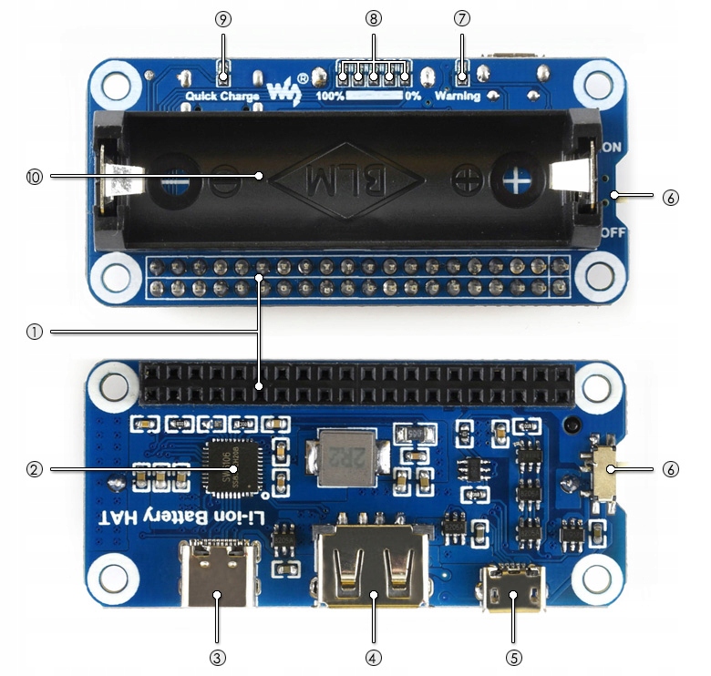 The Li-ion Battery HAT integrates SW6106 power bank management chip, allows providing 5V regulated power supply to your Pi from a 14500 battery, makes the Pi becomes a portable device. It will charge the battery as well, supports bi-directional quick charge. This module can be used as a universal mini power bank, also works with other 5V devices.