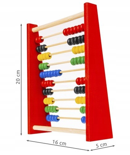 - SPECYFIKACJA - kolor: wielokolorowy; materiał: drewno; ilość rzędów: 10; ilość koralików: 100; wymiary: 5 x 16 x 20 cm; waga: 0,120 kg; waga w opakowaniu: 0,157 kg.