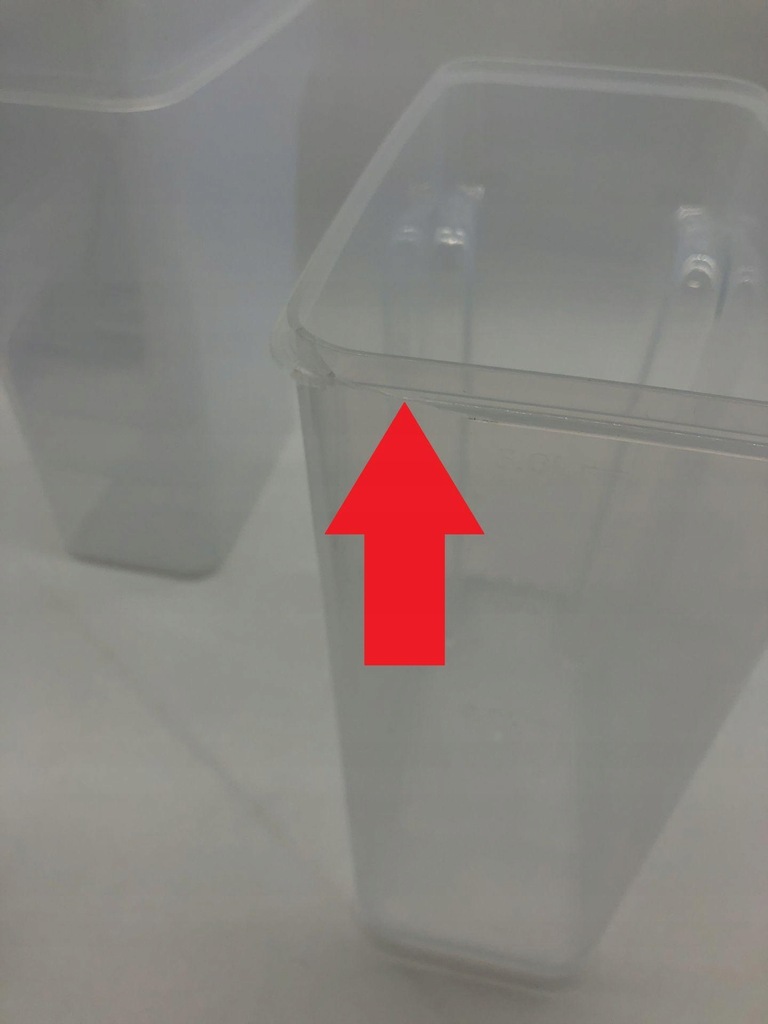 Wada w postaci uszczerbionego rogu na jednym z pojemników.