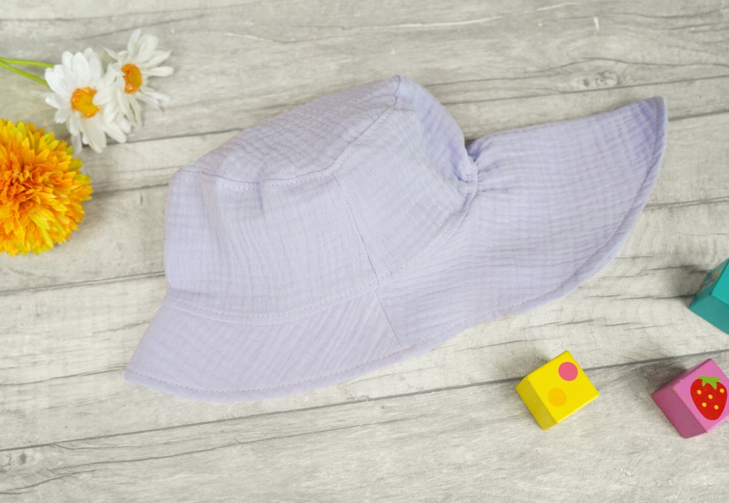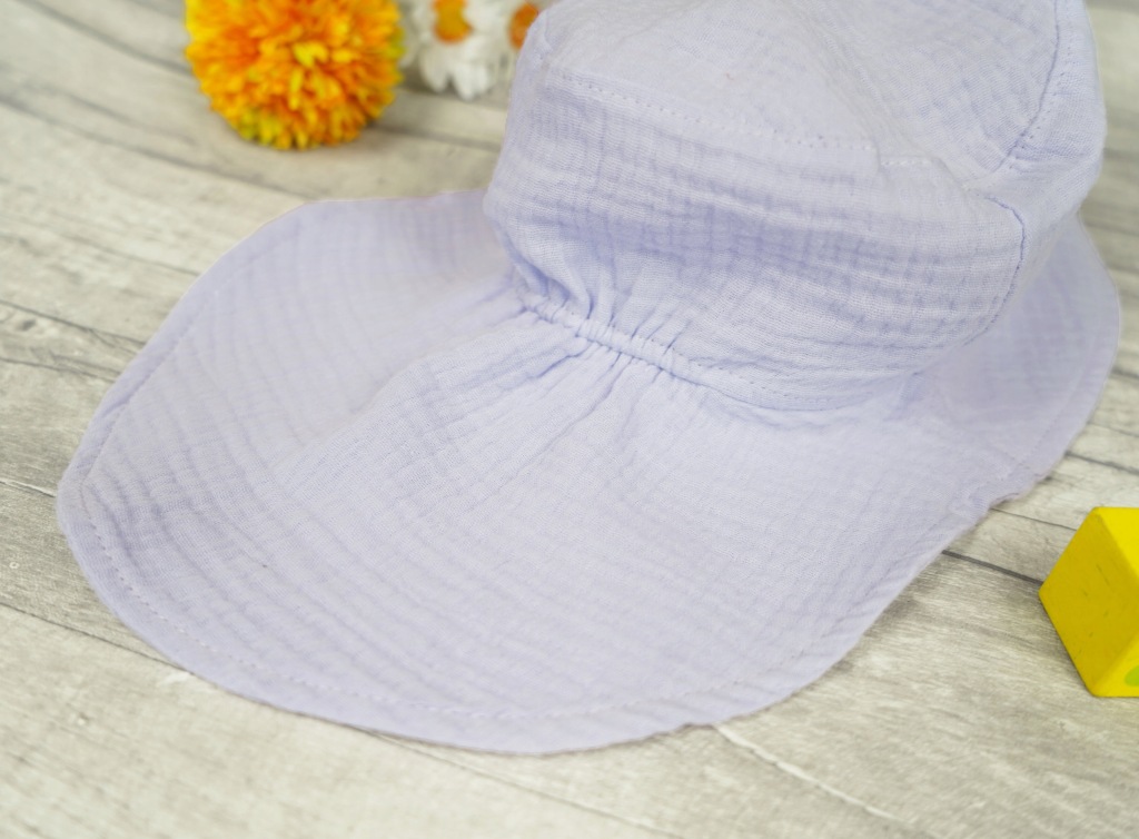 Letni kapelusz muślinowy w jasnym kolorze lila z przedłużonym tyłem osłaniającym kark.