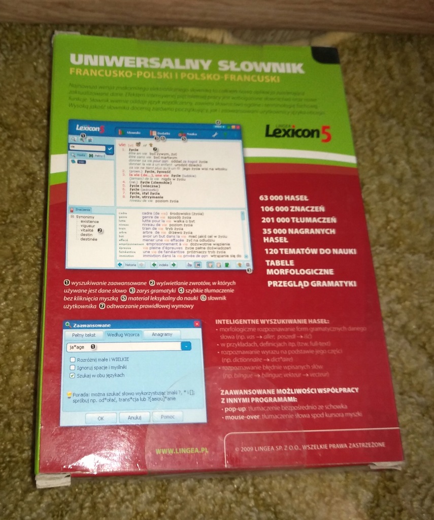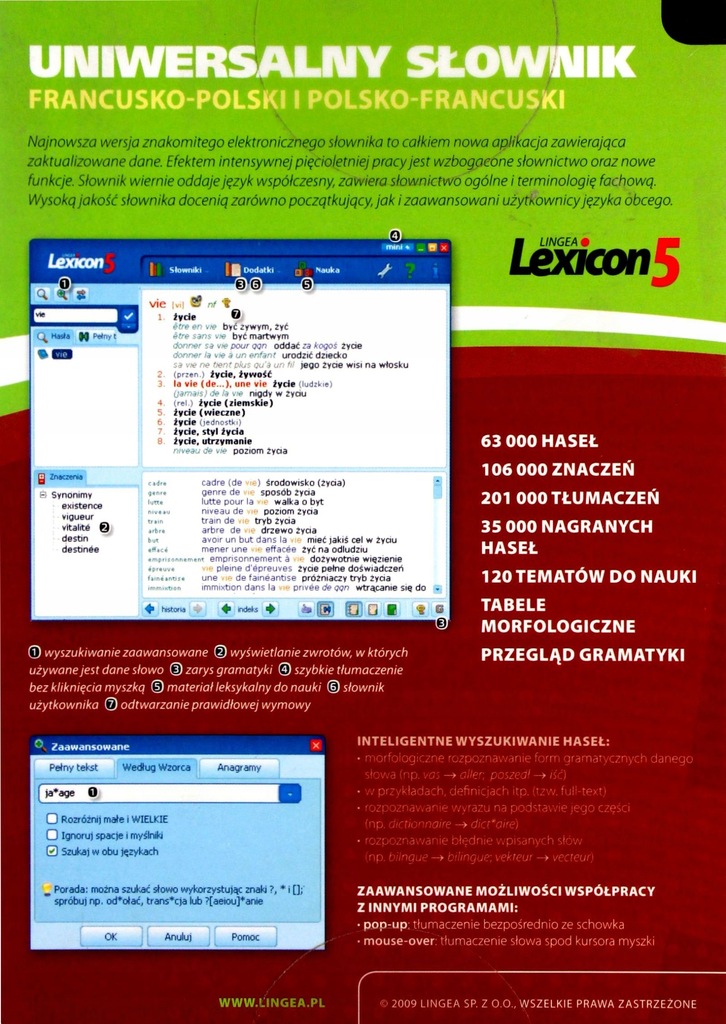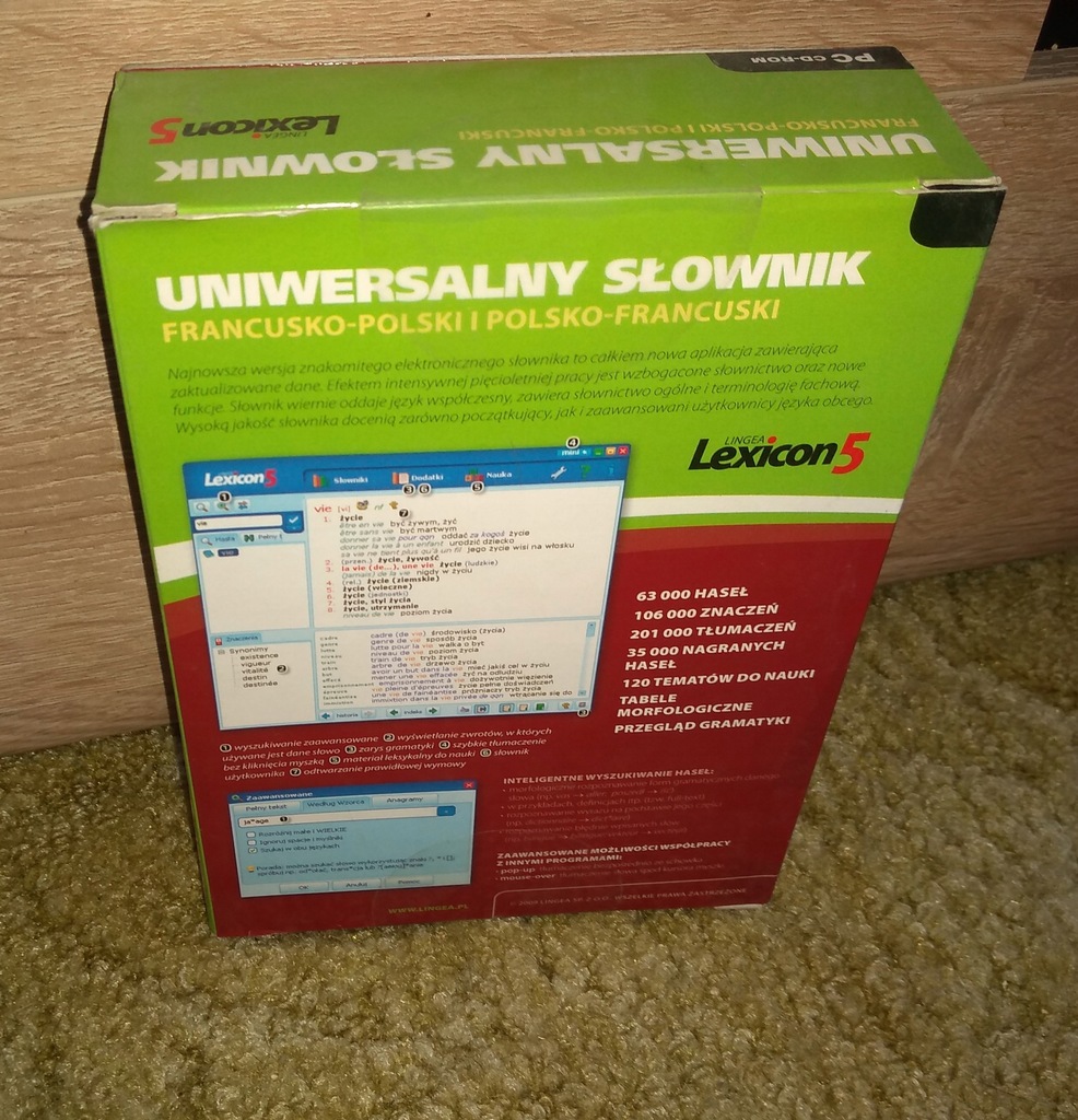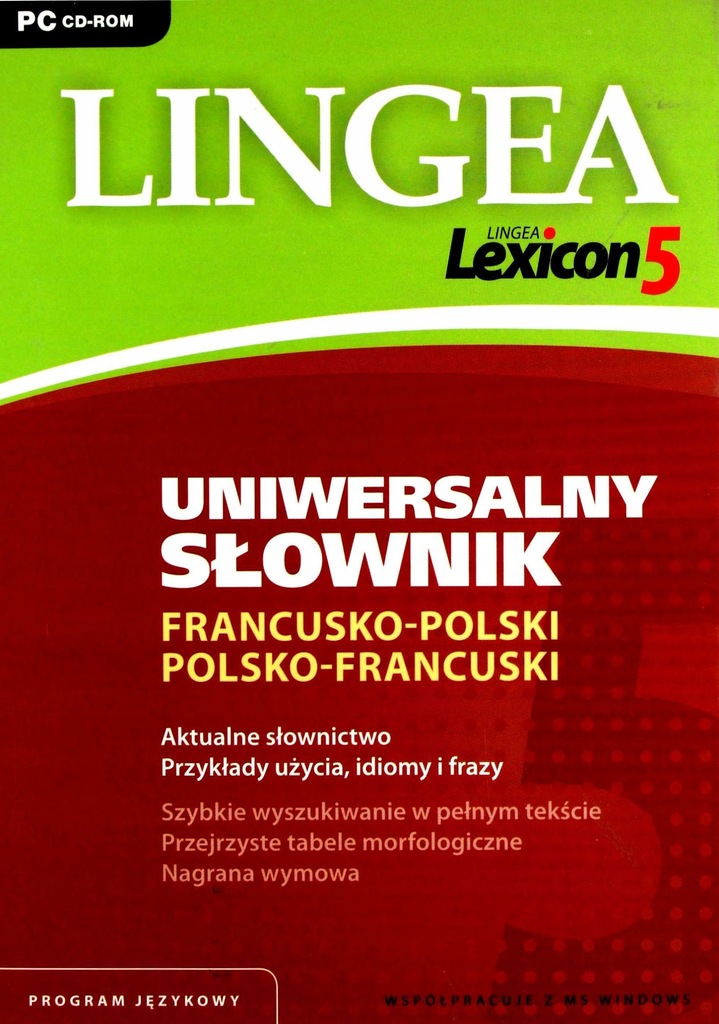 Lingea Lexicon 5. Uniwersalny słownik francusko-polski i polsko-francuski zawiera około 65 000 haseł, liczne przykłady, związki frazeologiczne oraz tabele odmian. Umożliwia odsłuchanie prawidłowej wymowy, zawiera