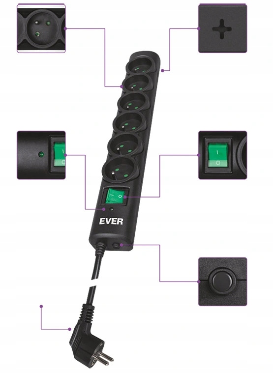 Nowa listwa EVER posiada sześć uziemionych gniazd sieciowych wyposażonych dodatkowo w ochronę CHILD PROTECTION. Uniemożliwia ona dostęp dzieciom do elementów niebezpiecznych, zapobiega włożeniu palca lub różnych przedmiotów do gniazdka i bezpośrednio chroni najmłodszych przed porażeniem.