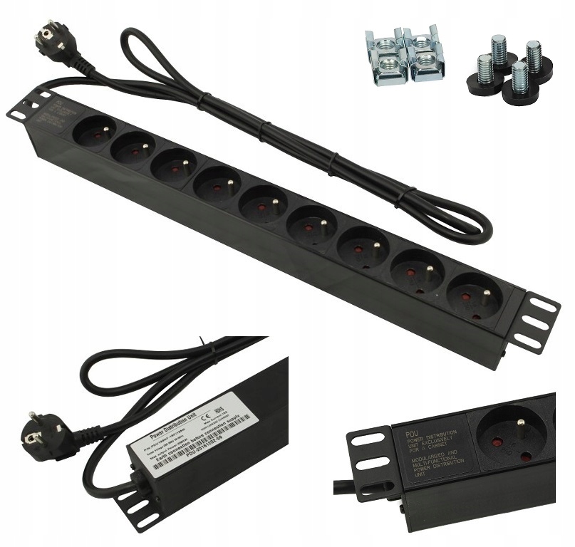 Solidna obudowa jest wykonana z tworzywa w kolorze czarnym, gniazda są wykonane z wytrzymałego ABS. Do listwy dołączony jest zestaw śrub mocujących wraz z koszyczkami i podkładkami. Uchwyty do racka są metalowe.