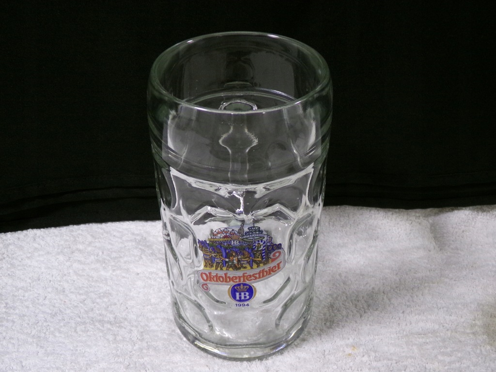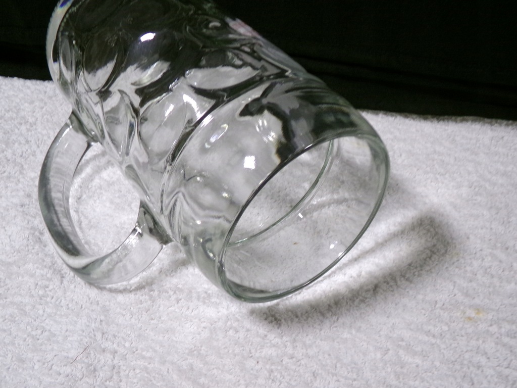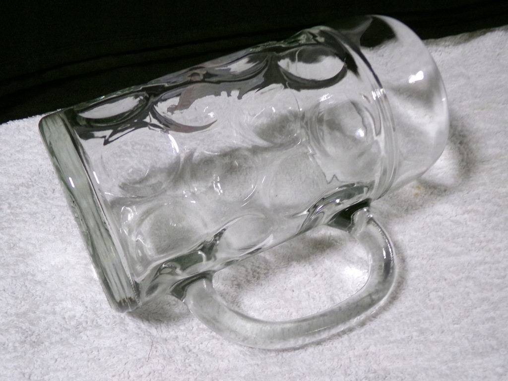 Szklany kufel o średnicy środka 9,5 cm,wysokości `20 cm,wadze 1,32 kg.Stan zachowany bardzo dobry,bez uszkodzeń.