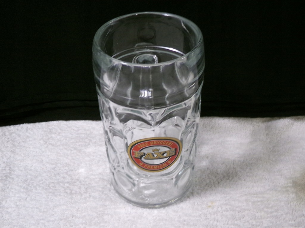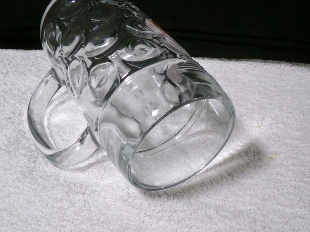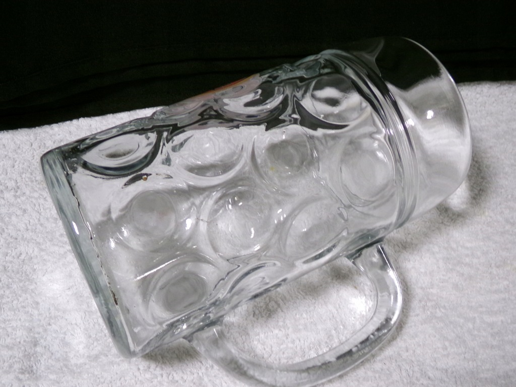 Szklany kufel o średnicy środka 9,5 cm,wysokości `20 cm,wadze 1,22 kg.Stan zachowany bardzo dobry,bez uszkodzeń.