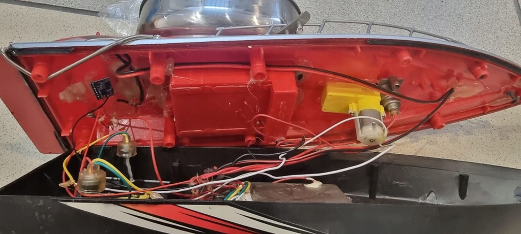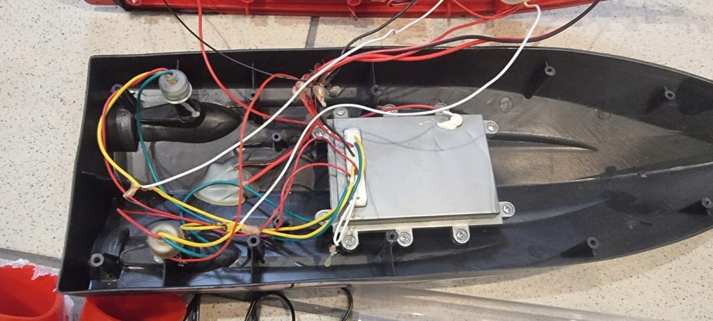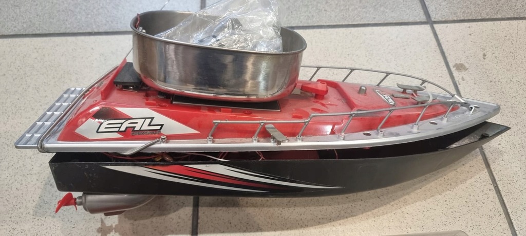 Łódka jest rozkręcona, wewnątrz wygląda na to, że jest kompletna, nie ma akumulatora oraz baterii do nadajnika. Są boje boczne, nadajnik, zasilacz, osłony wirników