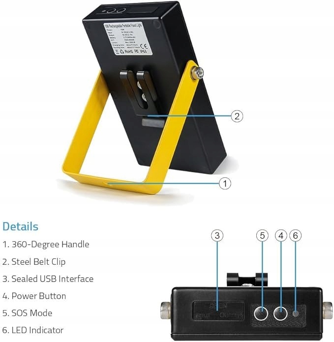 Mocna metalowa obudowa, wodoodporność IP65, 2 ustawienia jasności i tryb SOS