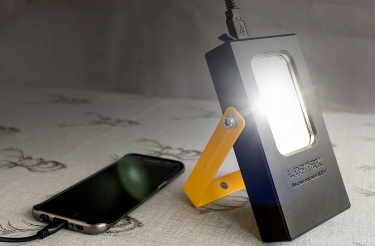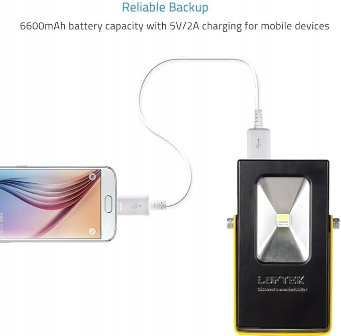 Przenośny reflektor Loftek jest wyposażony w baterię o pojemności 6600 mAh, którą można wykorzystać jako zewnętrzny power bank do ładowania urządzeń mobilnych. W zależności od modelu smartfona powinno wystarczyć na około 1,5 do 2 pełnych ładowań. To oczywiście skróci czas pracy lampy LED.