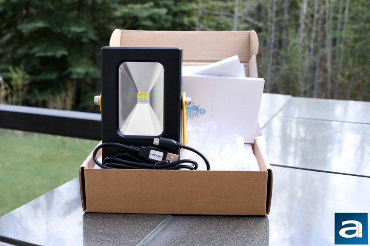 Przenośny reflektor Loftek o mocy 15 W jest dostarczany w zwykłym pudełku z pianką o zamkniętych komórkach w celu ochrony. Do produktu dołączony jest kabel USB o długości trzech stóp, instrukcja obsługi i karta gwarancyjna.