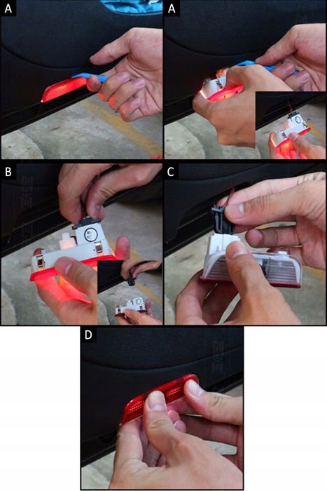 Zestaw bezinwazyjny bez konieczności wiercenia, dłubania czy wycinania. Lampki pasują bez jakichkolwiek przeróbek, wystarczy zamontować je w miejsce oryginalnych lampek umiejscowionych na dole drzwi.