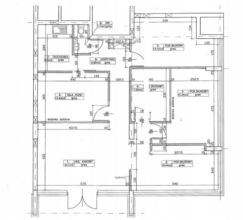 Całość powierzchni to 113,18 m2, na której można wydzielić oddzielne pomieszczenia zgodnie z potrzebami. Obecnie w lokalu znajduje się duże pomieszczenie ok. 60 m2 oraz dwa mniejsze, korytarz, kuchnia i toaleta.