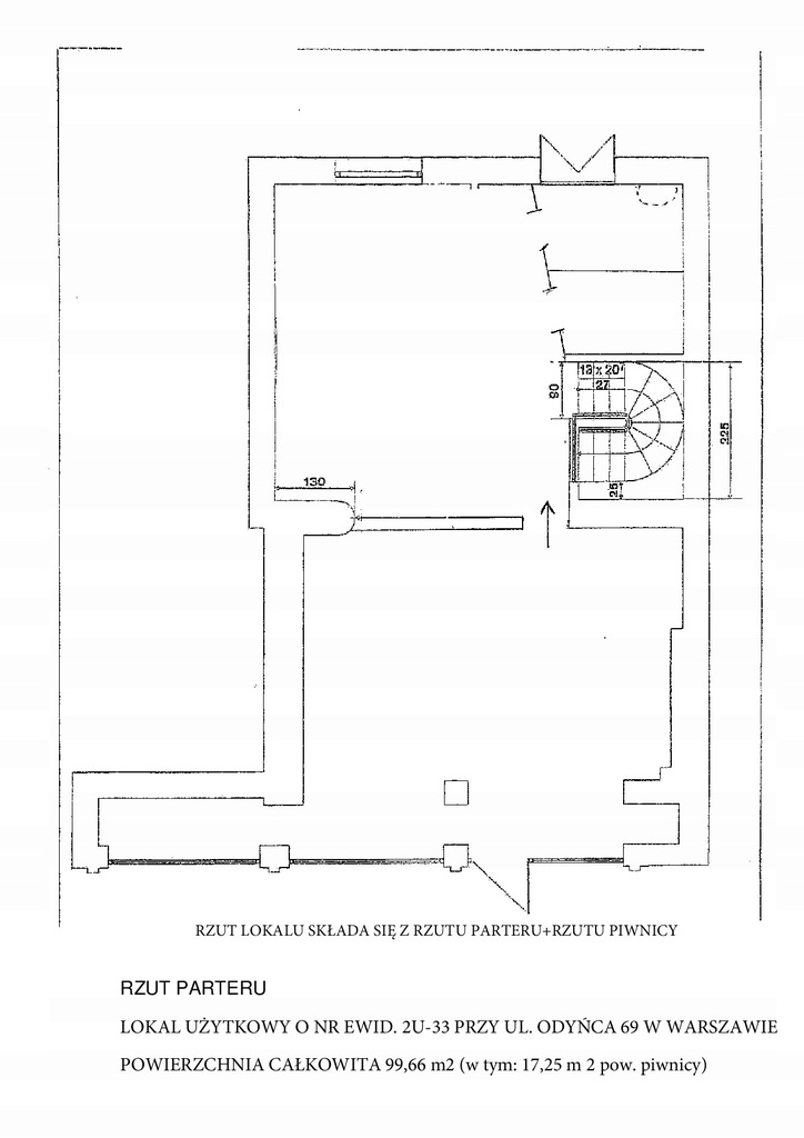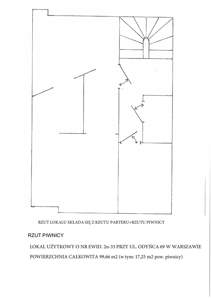 Lokal usytuowany jest na parterze (pow. 82,41 m2) i częściowo na poziomie piwnic (pow. 17,25 m2) budynku mieszkalnego wielorodzinnego. Całkowita powierzchnia lokalu wynosi 99,66 m2. Do lokalu prowadzą dwa wejścia: jedno bezpośrednio od ulicy Odyńca z dobrze widocznymi dużymi witrynami okiennymi oraz drugie od zaplecza – zamknięte i nieużywane (brak klucza). Nieruchomość składa się z dwóch dużych otwartych pomieszczeń w części naziemnej oraz pomieszczenia na poziomie piwnicy wraz z pomieszczeniem WC i małą kotłownią.